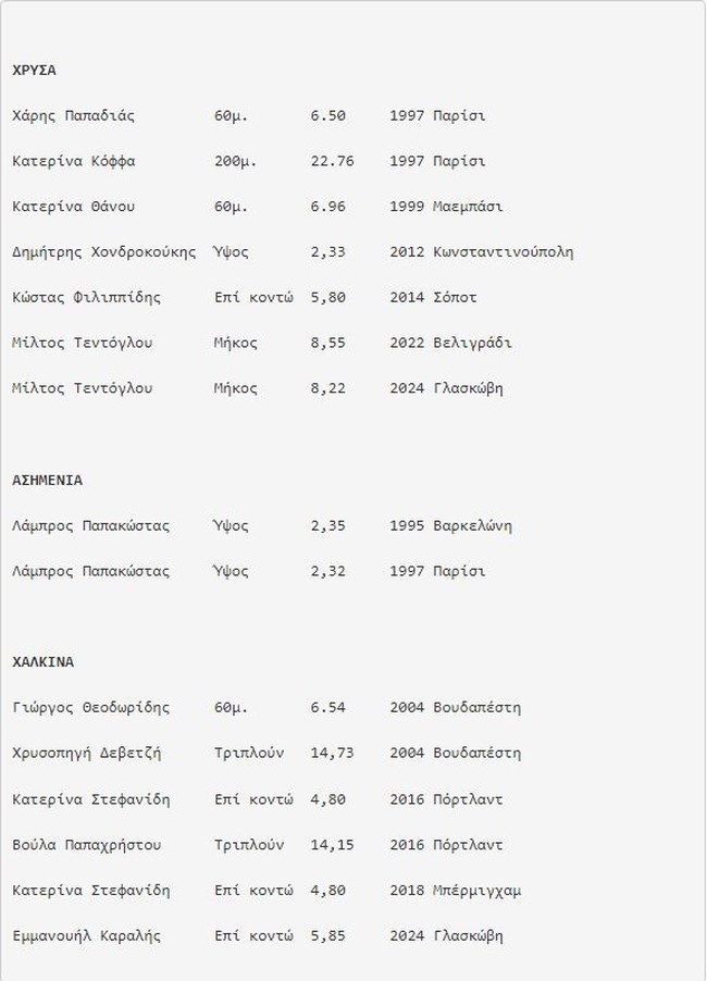 Με το χάλκινο που κατέκτησε ο Εμμανουήλ Καραλής στο άλμα επί κοντώ στη Γλασκώβη (είχε προηγηθεί το χρυσό του Μίλτου Τεντόγλου στο μήκος), η Ελλάδα έφτασε τα 15 μετάλλια (επτά χρυσά, δύο ασημένια και έξι χάλκινα) στην ιστορία του Παγκοσμίου πρωταθλήματος κλειστού στίβου.