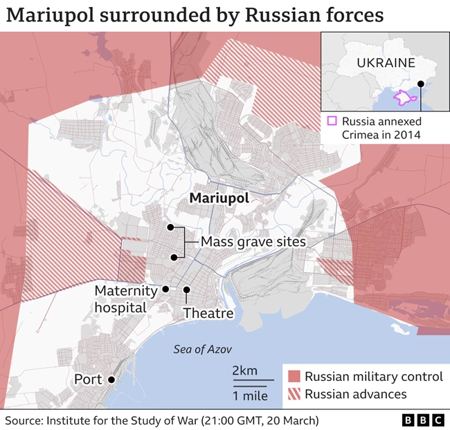 Σφυροκοπούν τη Μαριούπολη με το πυροβολικό τους, με ρουκέτες και πυραύλους έχοντας καταστρέψει σχεδόν το 90% της πόλης. Έχουν επίσης αποκόψει την πρόσβαση σε ηλεκτρικό, θέρμανση, πόσιμο νερό, τρόφιμα και ιατρικές προμήθειες προκαλώντας ανθρωπιστική καταστροφή για την οποία η Μόσχα κατηγορεί την Ουκρανία ότι αρνείται να παραδοθεί καθώς απέρριψε το τελεσίγραφο που είχε προθεσμία ως τα ξημερώματα της Δευτέρας 21 Μαρτίου. Οι Ουκρανοί από την πλευρά τους, κατηγορούν τη Ρωσία ότι θέλει να επιβάλλει λιμό στην Μαριούπολη.