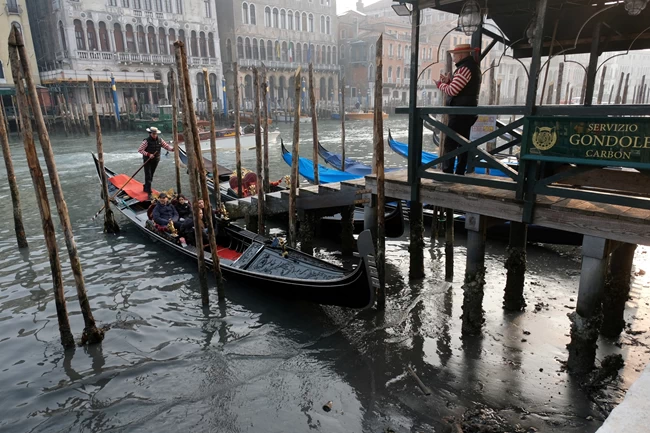 Λόγω της ακραία χαμηλής παλίρροιας, οι γόνδολες, τα θαλάσσια ταξί και τα ασθενοφόρα δεν μπορούν να πλοηγηθούν σε ορισμένα από τα κανάλια της Βενετίας.
