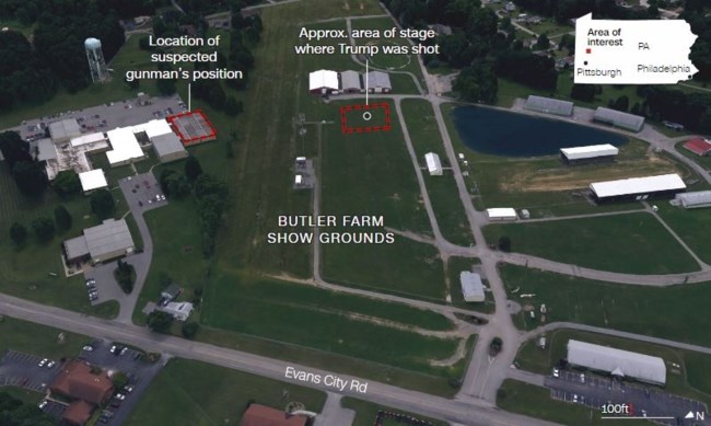 Το CNN, στην ανάλυσή του για το σημείο από όπου έγινε η επίθεση, σημειώνει ότι ήταν σε απόσταση μόλις 120 με 150 μέτρων από την εξέδρα από την οποία θα μιλούσε ο Τραμπ.