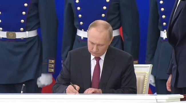 Δήλωσε ότι υπάρχουν τέσσερις νέες περιοχές της Ρωσίας, καθώς ανακοινώνει την επίσημη προσάρτηση των περιοχών Χερσώνα, Ζαπορίζια, Ντονέτσκ και Λουχάνσκ της Ουκρανίας.
