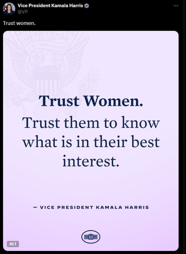 "Εμπιστευτείτε τις γυναίκες, προκειμένου να ξέρουν τι είναι καλύτερο για το συμφέρον τους"! Αυτό είναι το τελευταίο προεκλογικό μήνυμα της Κάμαλα Χάρις ενόψει των προεδρικών εκλογών στις ΗΠΑ, με την πρόεδρο των Δημοκρατικών να "κονταροχτυπιέται" με τον Ντόναλντ Τραμπ σε ένα εκλογικό θρίλερ για το οποίο ουδείς μπορεί να μιλήσει με σιγουριά για το αποτέλεσμα.