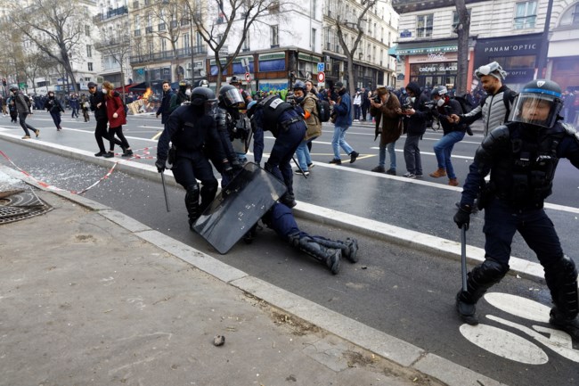 Οι συγκρούσεις των διαδηλωτών με τα ΜΑΤ είναι σφοδρές και δεν λείπουν καθημερινά οι τραυματισμοί. Σοκάρει μάλιστα το βίντεο που οι άντρες των γαλλικών ΜΑΤ στην κυριολεξία σέρνουν από τα ρούχα του, τον συνάδελφό τους, που έχει πέσει στην άσφαλτο μην έχοντας τις αισθήσεις του.