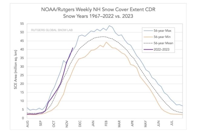 Αυτή η τόσο σημαντική έκταση χιονιού στο Βόρειο Ημισφαίριο πριν από την επίσημη έναρξη της χειμερινής περιόδου θα μπορούσε να αποτελέσει έναν σημαντικό δείκτη για το πώς ενδεχομένως θα εξελιχθεί ο φετινός χειμώνας στην Ευρώπη και τη Βόρεια Αμερική.