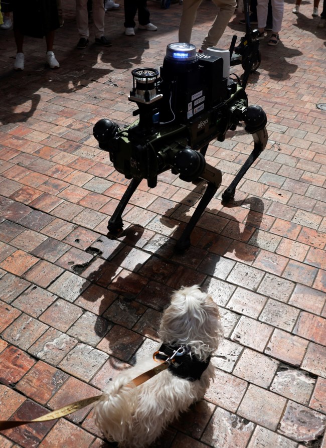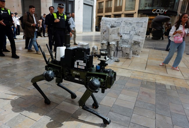 Η αστυνομία στη Μάλαγα έβγαλε σήμερα έναν σκύλο-ρομπότ σε δοκιμαστική περιπολία στο κέντρο της ισπανικής πόλης, προς τέρψιν των περαστικών, ορισμένοι εκ των οποίων μιμήθηκαν το βαρύ περπάτημά του ή σύστησαν τα κατοικίδιά τους στο ρομπότ που στριφογυρίζει και διαθέτει λαμπάκια που αναβοσβήνουν πάνω στο κεφάλι του.