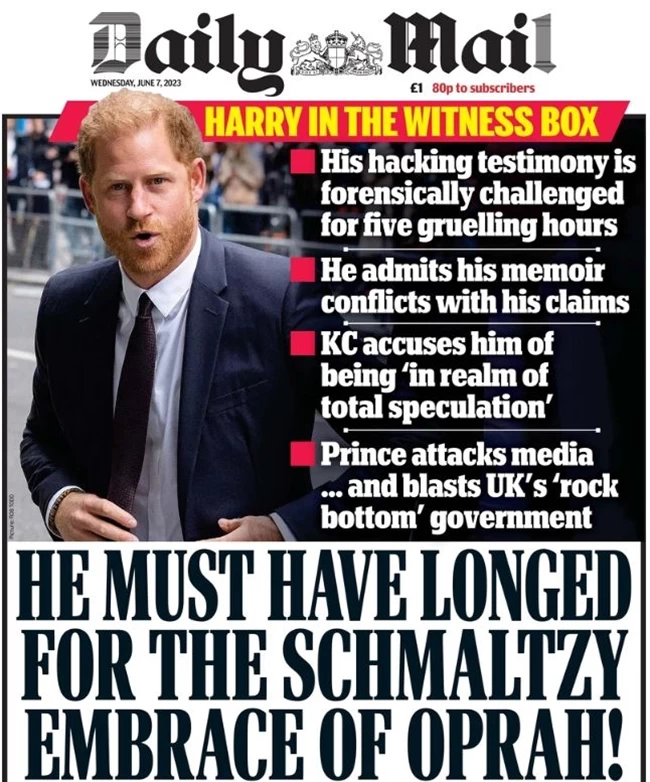 "Ο Χάρι θα πρέπει να λαχταρούσε την γλυκανάλατη αγκαλιά της Όπρα!", λέει το πρωτοσέλιδο της Daily Mail, μια αναφορά στη συνέντευξη που παραχώρησε το ζευγάρι στην Όπρα Γουίνφρι το 2021.