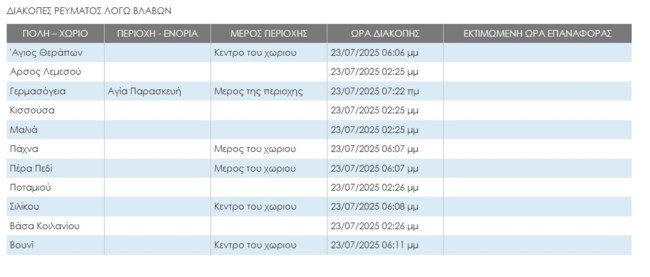 Χωρίς ρεύμα περιοχές της Λεμεσού