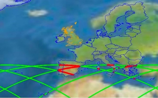 Χάρτης του Οργανισμού της Ευρωπαϊκής Ένωσης για την Αεροπορική Ασφάλεια, με τις περιοχές που αναμένεται να πέσουν συντρίμμια. Με κόκκινο χρώμα τα ηπειρωτικά εδάφη, στα οποία υπάρχει κίνδυνος για ζημιές και τραυματισμούς. Με πράσινο χρώμα οι θαλάσσιες περιοχές για τις οποίες δεν ενέχει κίνδυνος
