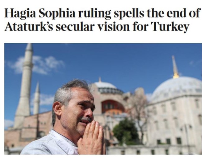 Ως συμβολική στιγμή που αναστατώνει τη Δύση και ανατρέπει την προηγούμενη συμβολική κίνηση, με την οποία ο Κεμάλ Ατατούρκ έδειξε τη δέσμευσή του στο κοσμικό κράτος, περιγράφουν οι Times την απόφαση Ερντογάν για τη μετατροπή της Αγιά Σοφιάς σε τζαμί.