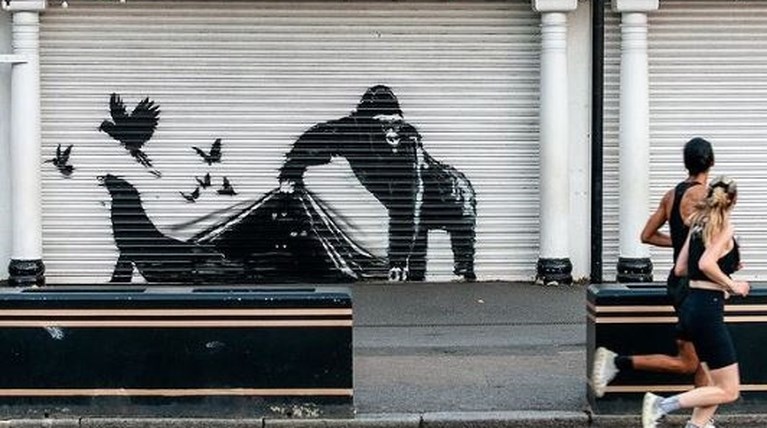 Το έργο στον ζωολογικό κήπο δείχνει έναν γορίλα να ανασηκώνει το μεταλλικό ρολό για να απελευθερώσει πουλιά και έναν θαλάσσιο ελέφαντα. Ο Μπάνκσι έχει αναρτήσει όλες τις τοιχογραφίες στον λογαριασμό του στο Instagram.
