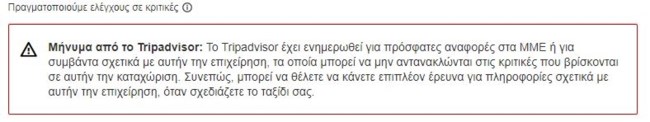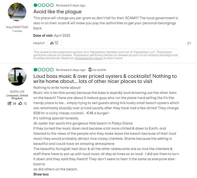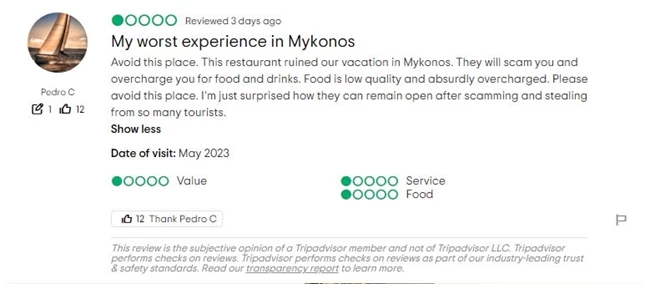 Η προειδοποίηση είναι κατεδαφιστική για το μυκονιάτικο εστιατόριο που παρουσιάζεται ως παραθαλάσσιο oyster bar αλλά λαμβάνει σχεδόν αποκλειστικά αρνητικές κριτικές. Η πλατφόρμα θέλωντας να διαφυλάξει την αξιοπιστία της, καλεί τους μελλοντικούς πελάτες του εν λόγω εστιατορίου, να κάνουν "επιπλέον έρευνα για πληροφορίες σχετικά με την επιχείρηση".