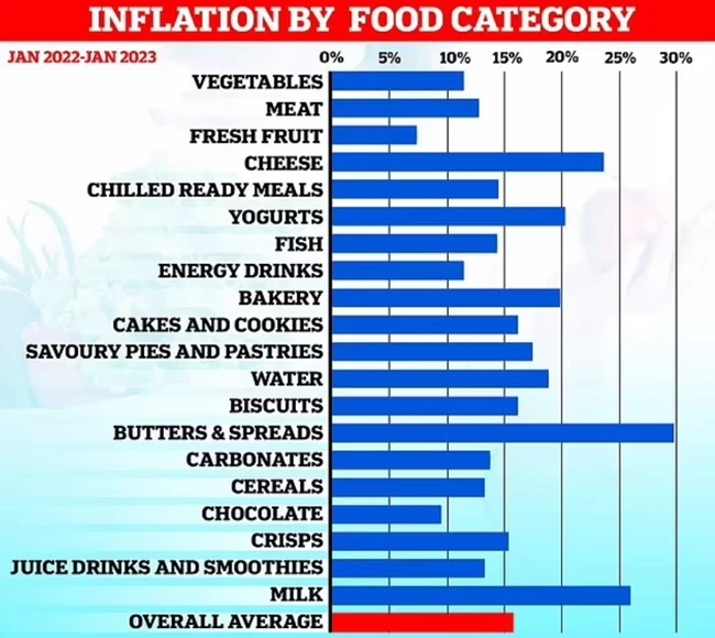 Για παράδειγμα, η τιμή μιας συσκευασίας ζυμαρικών σπαγγέτι έχει διπλασιαστεί μέσα σε μία διετία από 0,50 της λίρας σε 0,95. Το ίδιο συμβαίνει και σε δημοφιλή είδη όπως οι προτηγανισμένες τηγανητές πατάτες ή οι μαρμελάδες. Η μαρμελάδα φράουλα αυξήθηκε από 73 πένες σε 1,15 λίρες την ίδια περίοδο ενώ οι πατάτες από 1,24 λίρες σε 1,80.