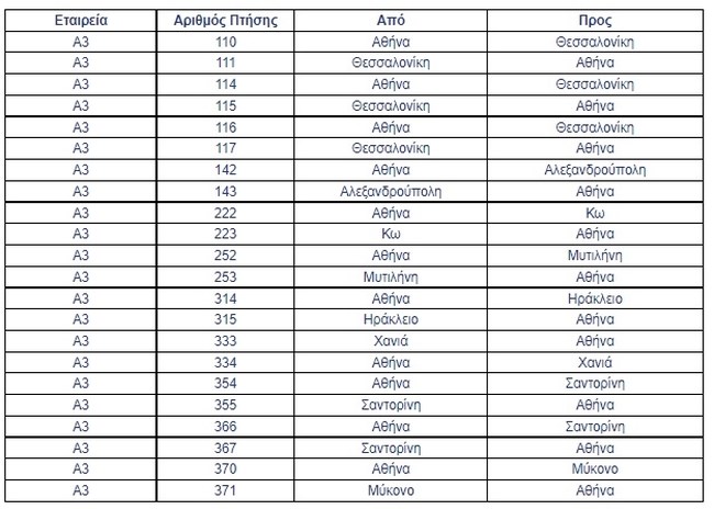Η AEGEAN και η Olympic Air ενημερώνουν το επιβατικό κοινό ότι την Τετάρτη, 9 Νοεμβρίου 2022, λόγω της συμμετοχής των Ελεγκτών Εναέριας Κυκλοφορίας (ΕΕΕΚΕ) καθώς και της Ομοσπονδίας Συλλόγων Υπηρεσίας Πολιτικής Αεροπορίας (Ο.Σ.Υ.Π.Α.), σε 6ωρη (10:00 – 16:00 τοπική ώρα) και σε 24ωρη αντιστοίχως στάση εργασίας, είναι υποχρεωμένες να προβούν συνολικά σε ακυρώσεις των παρακάτω 50 πτήσεων καθώς και σε τροποποιήσεις των παρακάτω 42 πτήσεων, τόσο του εσωτερικού όσο και του εξωτερικού δικτύου τους.