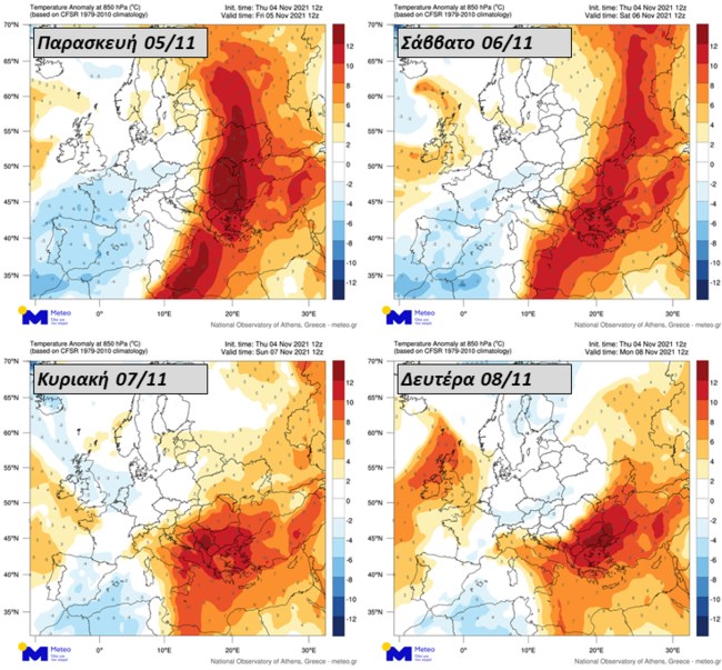 Η κίνηση θερμών αέριων μαζών από την Αφρική προς την περιοχή της χώρας μας θα προκαλέσει πολύ υψηλές για την εποχή θερμοκρασίες, τουλάχιστον έως και τη Δευτέρα 8/11, ενώ γενικότερα η Ανατολική Ευρώπη θα αποτελέσει τη θερμότερη περιοχή της Ευρώπης. Στα υπόλοιπα τμήματα της ηπείρου μας οι θερμοκρασίες θα διατηρηθούν κοντά στις φυσιολογικές ή σε ελαφρώς χαμηλές για την εποχή θερμοκρασίες.
