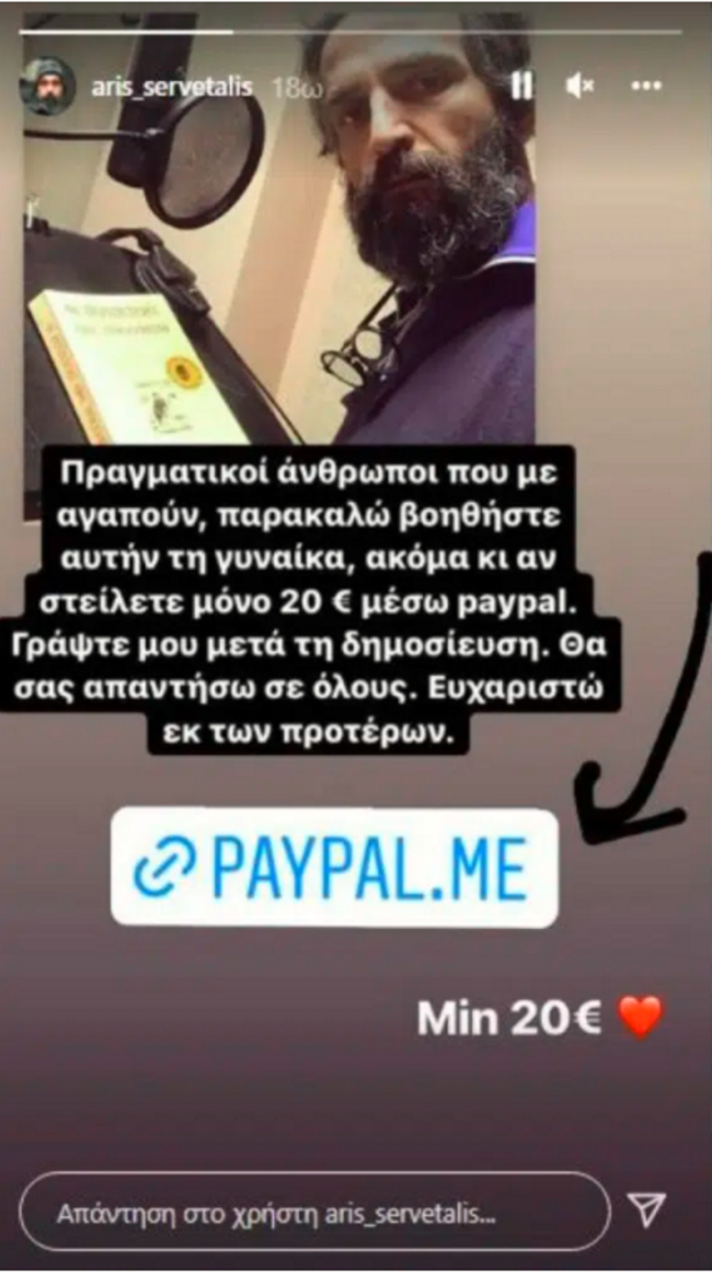 Εκεί είπα ότι μάλλον κάτι δεν είναι πολύ φυσιολογικό. Απευθύνθηκα στις αρχές, στη δίωξη ηλεκτρονικού εγκλήματος. Έκαναν ότι μπορούσαν οι άνθρωποι. Δυστυχώς δε γινόταν να σταματήσει εκείνη τη στιγμή. Λυπάμαι πολύ γι’ αυτούς που μπήκαν στη διαδικασία να καταθέσουν κάποια χρήματα αλλά νομίζω ότι η αξία της πρόθεσης και της προαίρεσης είναι πιο σημαντική από το να την εκμεταλλευτεί κάποιος. Τώρα ο λογαριασμός ήρθε πάλι σε μένα, τον διαχειρίζομαι εγώ", αναφέρει χαρακτηριστικά σε InstaStory ο Άρης Σερβετάλης.