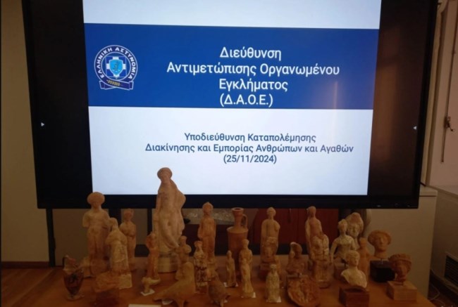 Δύο συλλήψεις πραγματοποιήθηκαν τη Δευτέρα 25 Νοεμβρίου στο πλαίσιο επιχείρησης της Υποδιεύθυνσης Καταπολέμησης Διακίνησης και Εμπορίας Ανθρώπων και Αγαθών, της Διεύθυνσης Αντιμετώπισης Οργανωμένου Εγκλήματος, κατά την οποία εντοπίστηκαν 172 αρχαία αντικείμενα σε τρεις οικίες στον Άλιμο Αττικής.