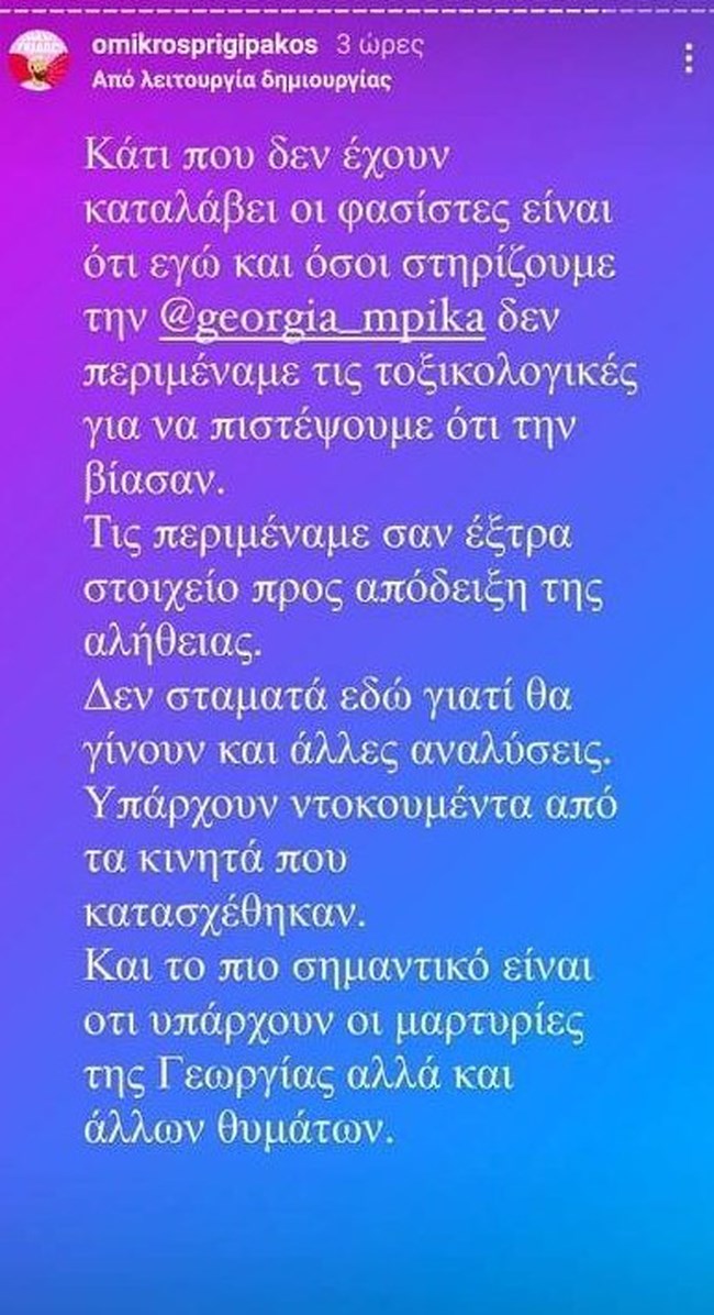 "Κάτι που δεν έχουν καταλάβει οι φασίστες είναι ότι εγώ και όσοι στηρίζαμε την Γεωργία Μπίκα δεν περιμέναμε τις τοξικολογικές για να πιστέψουμε ότι τη βίασαν. Τις περιμέναμε σαν έξτρα στοιχείο προς απόδειξη της αλήθειας. Δεν σταματά εδώ γιατί θα γίνουν και άλλες αναλύσεις. Υπάρχουν ντοκουμέντα από τα κινητά που κατασχέθηκαν. Και το πιο σημαντικό είναι ότι υπάρχουν οι μαρτυρίες της Γεωργίας, αλλά και άλλων θυμάτων", έγραψε χαρακτηριστικά ο Ηλίας Γκιώνης.