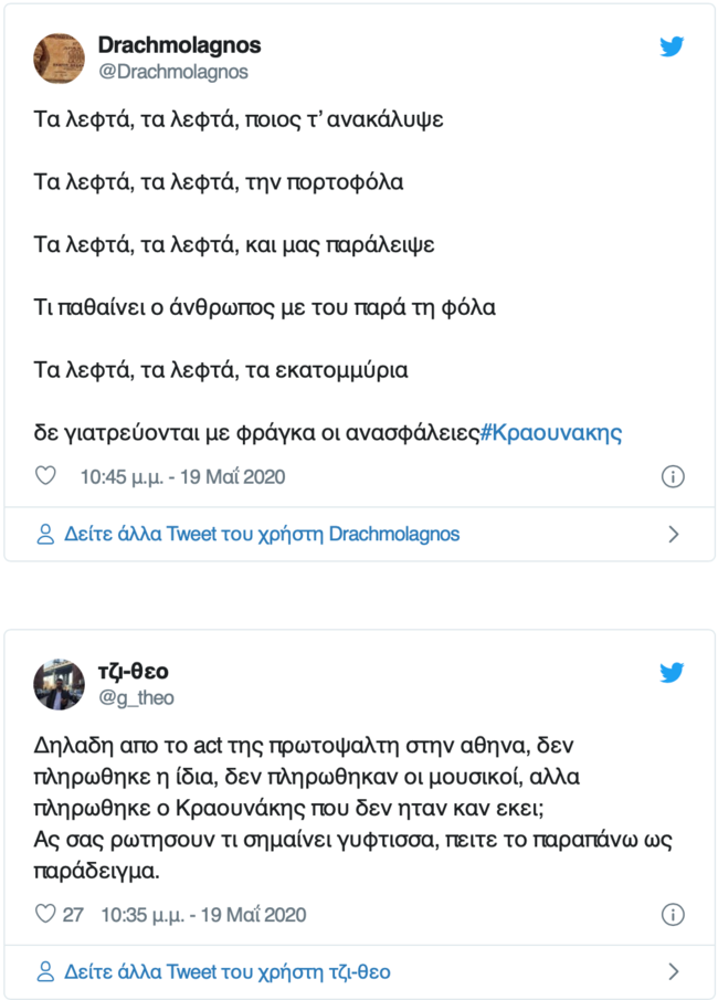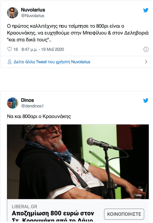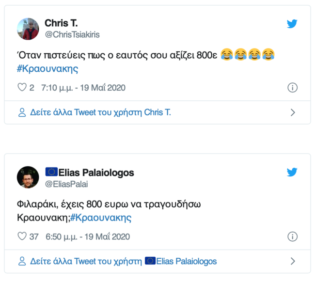 Το αίτημα Κραουνάκη για αποζημίωση προκάλεσε αρκετά σχόλια και στα social media με άλλους να σχολιάζουν "η τιμή, τιμή δεν έχει" και άλλους να γράφουν σκωπτικά "φιλαράκι έχεις 800 ευρώ να τραγουδήσω;".