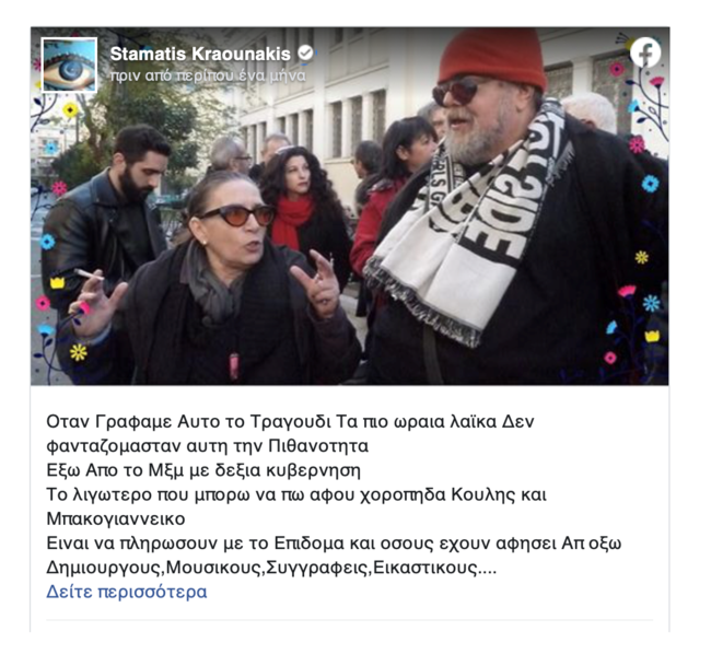 Με δύο αναρτήσεις στο facebook ο Σταμάτης Κραουνάκης υποστήριξε με καυστικότητα ότι δεν φανταζόταν ποτέ, όταν έγραφε το τραγούδι "Τα πιο ωραία λαϊκά", ότι θα το τραγουδούσαν έξω από το Μέγαρο Μαξίμου "με δεξιά κυβέρνηση". Μάλιστα προκάλεσε με απαξιωτικούς χαρακτηρισμούς τον Πρωθυπουργό και τον Δήμαρχο Αθηναίων και ζητά "να πληρώσουν με το επίδομα όσους έχουν αφήσει απ΄έξω", δηλαδή τραγουδιστές, μουσικούς, ηθοποιούς, καλλιτέχνες. Ο Καθένας είναι υπεύθυνος για τις Πράξεις του έγραψε και κατέληξε: "Εγώ δε θέλω το τραγούδι Μου, Στου Κούλη τα Λημέρια".