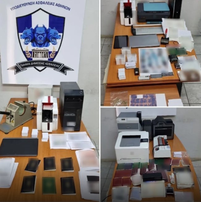 Σε 102 συνολικά έρευνες που πραγματοποιήθηκαν σε σπίτια και καταστήματα, σε Αττική, Θεσσαλονίκη και Ηλεία, βρέθηκαν και κατασχέθηκαν: πλήθος κινητών τηλεφώνων και ηλεκτρονικών συσκευών, 1.050 διαβατήρια και ταυτότητες ξένων χωρών, 72.000 ευρώ, πάνω από 30.000 ψηφιακά αρχεία ταυτοτήτων και διαβατήριων, ναρκωτικά και όπλα καθώς και 189 πλαστές σφραγίδες διάφορων Υπηρεσιών.
