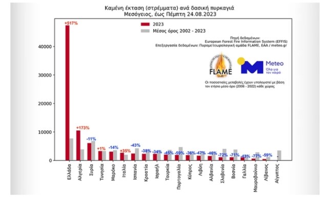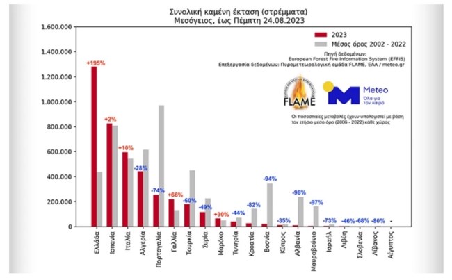 Καταγράφοντας 27 μεγάλες δασικές πυρκαγιές (>300 στρέμματα) έως την Πέμπτη 24 Αυγούστου.08.2023, η Ελλάδα κατατάσσεται έβδομη μεταξύ 20 Μεσογειακών χωρών, ενώ την ίδια στιγμή μέση καμένη έκταση ανά μεγάλη δασική πυρκαγιά, σημειώνει αύξηση +517% σε σύγκριση με τον αντίστοιχο μέσο όρο της περιόδου 2002 – 2022.