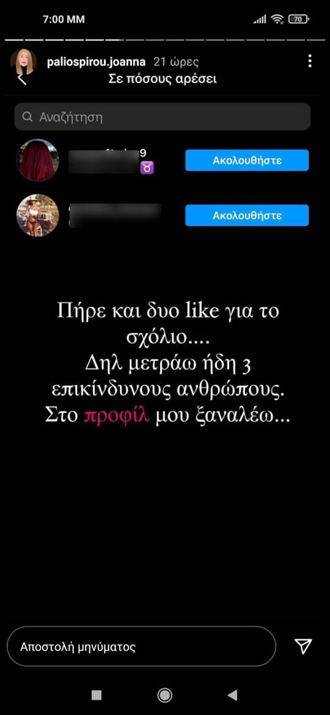 Η Ιωάννα δημοσίευσε αυτό το σχόλιο στα insta story της, και μάλιστα τόνισε πως δύο ακόμα άτομα έκαναν like, επισημαίνοντας ότι "μετράω ήδη τρεις επικίνδυνους ανθρώπους στο προφίλ μου".