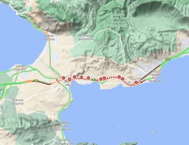 Λόγω της φωτιάς, διακόπηκε η κυκλοφορία τόσο στην παλιά όσο και στην νέα Εθνική Οδό Αθηνών - Κορίνθου από τον κόμβο των Αγ. Θεοδώρων μέχρι τον κόμβο Επιδαύρου και στα δύο ρεύματα. Ωστόσο, προ ολίγου η κυκλοφορία άνοιξε και στην παλιά και τη νέα εθνική οδός Αθηνών – Κορίνθου και στα δυο ρεύματα.