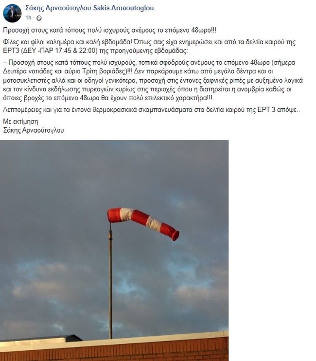 "Προσοχή στους κατά τόπους πολύ ισχυρούς ανέμους το επόμενο 48ωρο!!!Φίλες και φίλοι καλημέρα και καλή εβδομάδα! Όπως σας είχα ενημερώσει και από τα δελτία καιρού της ΕΡΤ3 (ΔΕΥ -ΠΑΡ 17:45 & 22:00) της προηγούμενης εβδομάδας: – Προσοχή στους κατά τόπους πολύ ισχυρούς, τοπικά σφοδρούς ανέμους το επόμενο 48ωρο (σήμερα Δευτέρα νοτιάδες και αύριο Τρίτη βοριάδες)!!! Δεν παρκάρουμε κάτω από μεγάλα δέντρα και οι μοτοσυκλετιστές αλλά και οι οδηγοί γενικότερα, προσοχή στις έντονες ξαφνικές ριπές με αυξημένο λογικά και τον κίνδυνο εκδήλωσης πυρκαγιών κυρίως στις περιοχές όπου η διατηρείται η ανομβρία καθώς οι όποιες βροχές το επόμενο 48ωρο θα έχουν πολύ επιλεκτικό χαρακτήρα!!!.Λεπτομέρειες και για τα έντονα θερμοκρασιακά σκαμπανευάσματα στα δελτία καιρού της ΕΡΤ 3 απόψε..".
