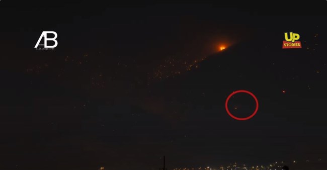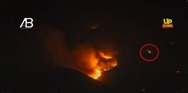 Στους κόκκινους κύκλους μπορεί να δει κανείς την εμφάνιση των νέων εστιών φωτιάς, εκατοντάδες μέτρα μακριά από το κύριο μέτωπο και κόντρα στην φορά του ανέμου, σε τρία χρονικά σημεία του βίντεο (0:40, 1:02 και 1:35).