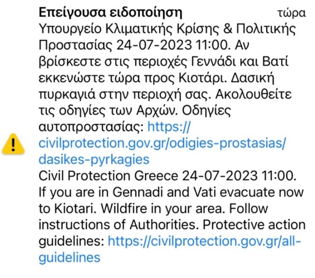Συγκεκριμένα το μήνυμα αναφέρει: "Αν βρίσκεστε στις περιοχές Γεννάδι και Βατί εκκενώστε τώρα προς Κιοτάρι. Δασική πυρκαγιά στην περιοχή σας. Ακολουθείτε τις οδηγίες των αρχών".