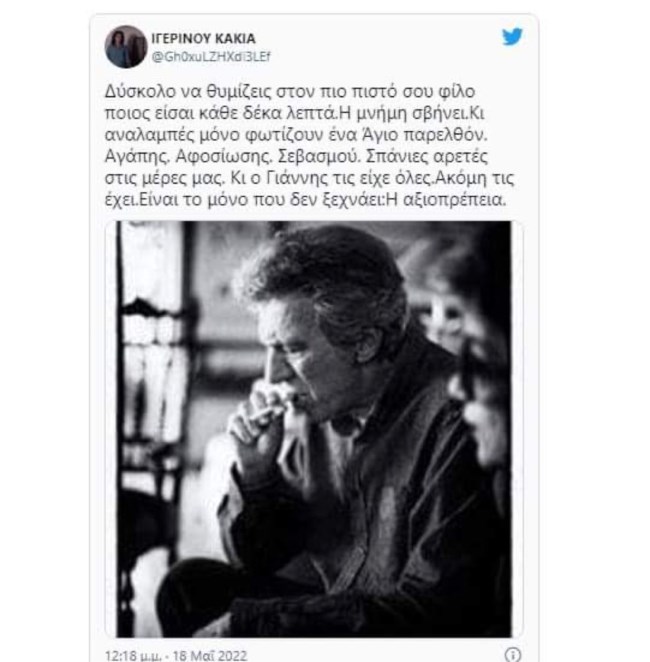 Στο tweet της η σεναριογράφος ανέφερε: "Δύσκολο να θυμίζεις στον πιο πιστό σου φίλο ποιος είσαι κάθε δέκα λεπτά.Η μνήμη σβήνει. Κι αναλαμπές μόνο, φωτίζουν ένα Άγιο παρελθόν. Αγάπης. Αφοσίωσης. Σεβασμού. Σπάνιες αρετές στις μέρες μας. Κι ο Γιάννης τις είχε όλες. Ακόμη τις έχει.Είναι το μόνο που δεν ξεχνάει: Η αξιοπρέπεια".