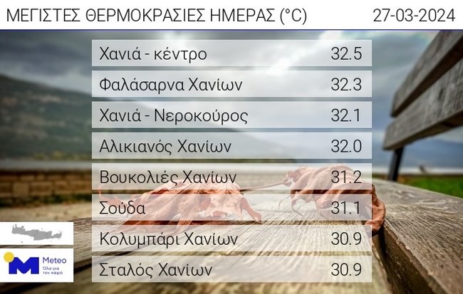 Η τιμή αυτή είναι η υψηλότερη από το 2010, χρονιά στην οποία ήδη λειτουργούσαν αρκετοί σταθμοί του meteo.gr στην Κρήτη. Οι αμέσως προηγούμενες μέγιστες τιμές στο νησί ήταν 30.1 βαθμοί σε Φαλάσαρνα και Βρύσες Χανίων, στις 31/03/2010.