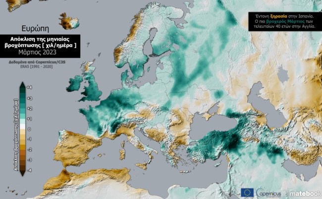 Επιπλέον, έντονη ξηρασία με απουσία βροχής καθ’όλη τη διάρκεια του μήνα παρατηρήθηκε σε περιοχές της Δυτικής Ευρώπης, όπως στην Ισπανία καθώς και στα Βαλκάνια. Αυξημένες βροχοπτώσεις σε Γαλλία και Αγγλία όπου στην Αγγλία καταγράφηκε ο πιο βροχερός Μάρτιος των τελευταίων 40 ετών (βλ. εικόνα 2).
