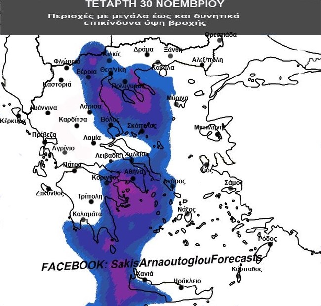 Μάλιστα, επισυνάπτει και έναν χάρτη, "δείχνει τις περιοχές όπου η πιθανότητα για έντονα φαινόμενα είναι μεγαλύτερη, την Τετάρτη", λέει ο προγνώστης για τις 30 Νοεμβρίου.