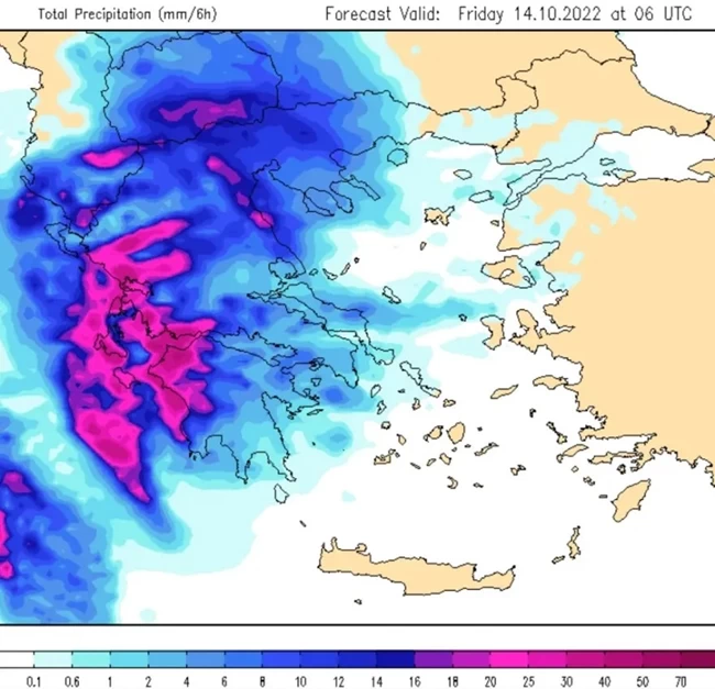 Σύμφωνα με τον Γιάννη Καλλιάνο, "κατά τη διάρκεια της κακοκαιρίας που θα ξεκινήσει από τα μεσάνυχτα της Πέμπτης και μέσα στη νύχτα προς την Παρασκευή, θα εκδηλωθούν δυνατές βροχές αρχικά στα δυτικά και εν συνεχεία μέσα στην ημέρα της Παρασκευής αλλά και το Σάββατο και σε πολλές από τις υπόλοιπες περιοχές της χώρας (συμπεριλαμβανομένης και της Αττικής). Όμως ειδικά στα Δυτικά οι βροχές θα είναι κατά τόπους έντονες. Πρόκειται για τη χρονική περίοδο από τα μεσάνυχτα της Πέμπτης έως και το μεσημέρι της Παρασκευής και ειδικά σε τμήματα των Επτανήσων, της Ηπείρου, της Δυτικής Στερεάς και της Δυτικής και Νότιας Πελοποννήσου. Η εικόνα αυτή αποτυπώνεται και στον χάρτη αθροιστικής βροχής 6ώρου (μεσάνυχτα Πέμπτης έως και πρωί Παρασκευής)".
