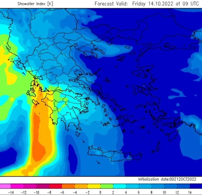 "Όπως φαίνεται και στην εικόνα παρακάτω, οι δείκτες αστάθειας στη Δυτική Ελλάδα το πρωινό της Παρασκευής είναι τέτοιοι που θεωρείται πλέον πολύ πιθανό να έχουμε στις προαναφερθείσες περιοχές ακόμα και κατά τόπους έντονα η πλημμυρικά φαινόμενα. Εκτιμώ ότι είναι αυξημένη η πιθανότητα ακόμη και για τοπικά ισχυρές χαλαζοπτώσεις διότι έτσι και αλλιώς θα υπάρξουν εκτεταμένα καταιγιδοφόρα νέφη που θα δίνουν εκείνη την ώρα έντονη ηλεκτρική δραστηριότητα. Ίσως να υπάρξει και μέσα στο Ιόνιο η αρκετές φορές εμφανιζόμενη σε κακοκαιρίες "γραμμή λαίλαπας" που σημαίνει ότι εκτεταμένες καταιγίδες σε σχεδόν ευθεία γραμμή και σε μήκος αρκετών χιλιομέτρων θα κινηθούν από την Αδριατική προς τα Επτάνησα" σημειώνει ο μετεωρολόγος.