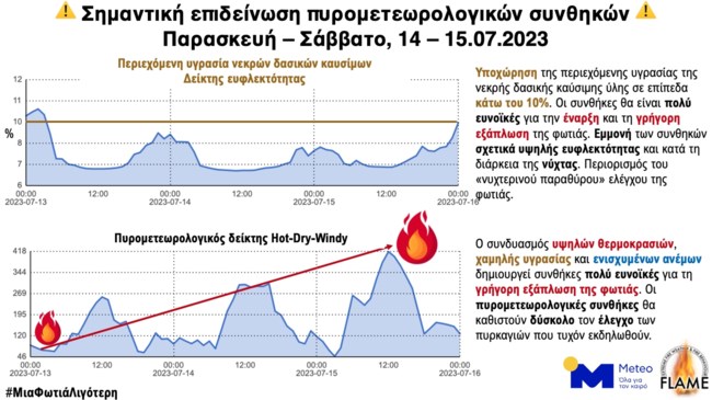 Τα νεότερα προγνωστικά στοιχεία υποδεικνύουν περαιτέρω επιδείνωση των πυρομετεωρολογικών συνθηκών από αύριο, Παρασκευή 14 Ιουλίου 2023, οπότε και η επικινδυνότητα θα είναι πολύ υψηλή σε Κυκλάδες, Λέσβο, Χίο, Σάμο, Ικαρία, Αν. Κρήτη, Ζάκυνθο και κατά τόπους σε Ν. Εύβοια, Αττική, Βοιωτία, Ηλεία, Μεσσηνία και Κεφαλονιά. Το Σάββατο 15 Ιουλίου 2023, η επικινδυνότητα αναμένεται να είναι πολύ υψηλή σε Αττική, Βοιωτία, Κ. και Ν. Εύβοια, Ν. Θεσσαλία, Αιτωλοακαρνανία, Κεφαλονιά, Ζάκυνθο, Ηλεία, Μεσσηνία, Λακωνία, Κυκλάδες, Δ. Κρήτη, Λήμνο, Χίο, Σάμο, Ικαρία, Αν. Ρόδο και κατά τόπους σε Έβρο, Κορινθία, Δ. Θεσπρωτια και Φθιώτιδα.