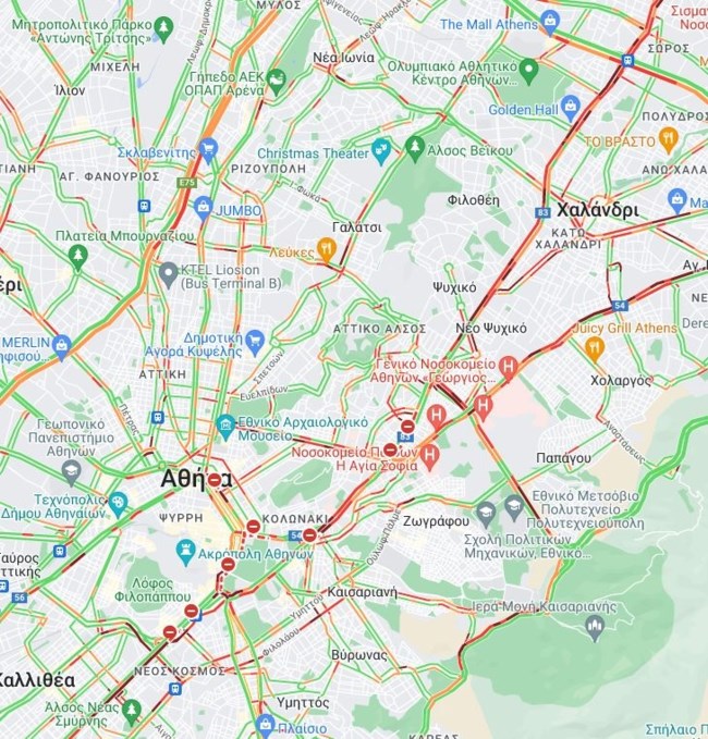 Στο "κόκκινο" βρίσκεται η κάθοδος της λεωφόρου Κηφισίας από το Μαρούσι έως και το ύψος της λεωφόρου Αλεξάνδρας, λόγω συγκέντρωσης εκπαιδευτικών έξω από το Μέγαρο Μουσικής.