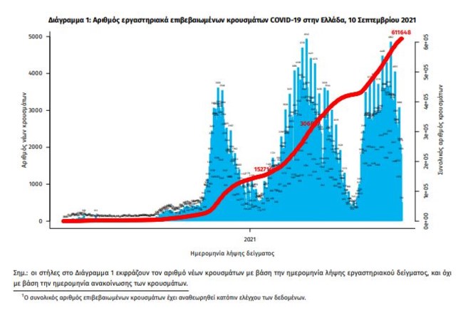 Τα νέα εργαστηριακά επιβεβαιωμένα κρούσματα της νόσου που καταγράφηκαν τις τελευταίες 24 ώρες είναι 2.132 , εκ των οποίων 18 εντοπίστηκαν κατόπιν ελέγχων στις πύλες εισόδου της χώρας. Ο συνολικός αριθμός των κρουσμάτων ανέρχεται σε 611.648 (ημερήσια μεταβολή +0.3%), εκ των οποίων 51.0% άνδρες.