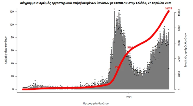 Την προηγούμενη Τρίτη 20 Απριλίου είχαν βρεθεί 3.789 κρούσματα οι θάνατοι ασθενών ήταν 87, και διασωληνωμένοι ήταν 847 ασθενείς. Το σύνολο PCR και Rapid τεστ ημέρας ήταν 78.428. Ο δείκτης θετικότητας της ημέρας στο σύνολο PCR και Rapid τεστ ήταν 4,83%