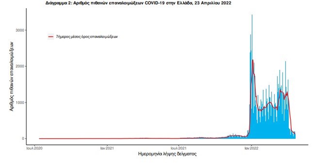 Ο αριθμός πιθανών νέων επαναλοιμώξεων που καταγράφηκαν τις τελευταίες 24 ώρες ήταν 149 ενώ από την αρχή της πανδημίας SARS-CoV-2 ο συνολικός αριθμός εκτιμάται σε 121.135(3.6% του συνολικού αριθμού των θετικών αποτελεσμάτων).1 Ημερήσια εξέλιξη της πανδημίας: