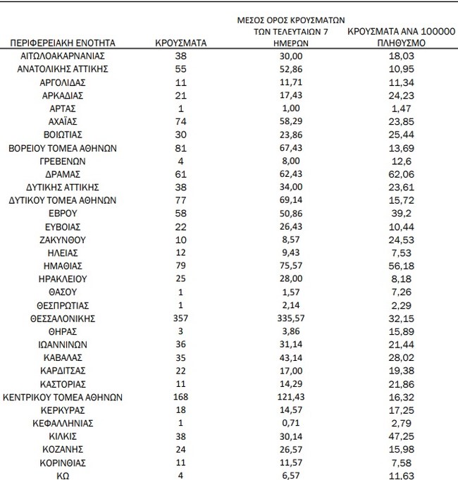 Αναλυτικά τα κρούσματα ανά περιφέρεια σύμφωνα με την ανακοίνωση του ΕΟΔΥ: