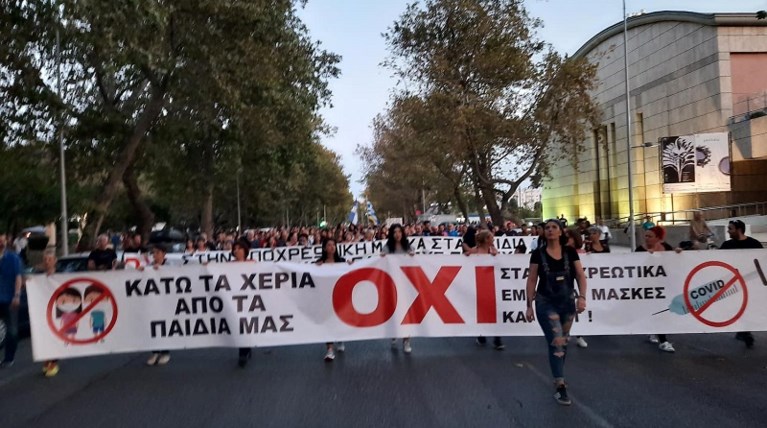 Οι αρνητές της μάσκας και των εμβολίων έδωσαν ραντεβού στο Άγαλμα του Μ. Αλεξάνδρου, στη νέα παραλία της πόλης όπου και ανήρτησαν πανό με συνθήματα όπως "Κάτω τα χέρια από τα παιδιά μας”.