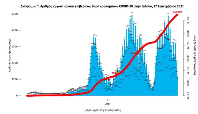 Χθες, Κυριακή 26 Σεπτεμβρίου, ανακοινώθηκαν 1.100 νέα κρούσματα, 24 θάνατοι και 337 διασωληνωμένοι. Μεταξύ των ασθενών που νοσηλεύονται διασωληνωμένοι, 303 (89.91%) είναι ανεμβολίαστοι ή μερικώς εμβολιασμένοι και 34 (10.09%) είναι πλήρως εμβολιασμένοι. Οι εισαγωγές νέων ασθενών Covid-19 στα νοσοκομεία της επικράτειας είναι 191 (ημερήσια μεταβολή +20.89%). Ο μέσος όρος εισαγωγών του επταημέρου είναι 185 ασθενείς