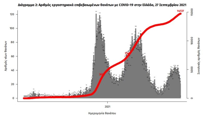 Οι νέοι θάνατοι ασθενών με COVID-19 είναι 47, ενώ από την έναρξη της επιδημίας έχουν καταγραφεί συνολικά 14.727 θάνατοι. Το 95.4% είχε υποκείμενο νόσημα ή/και ηλικία 70 ετών και άνω.