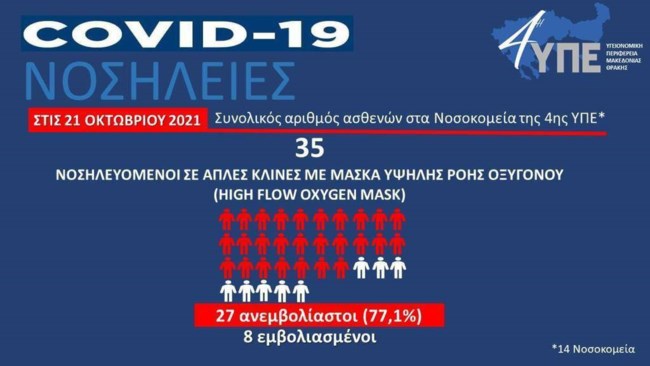 Στην 3η ΥΠΕ 22 συνάνθρωποί μας βρίσκονται νοσηλευόμενοι σε απλές κλίνες με μάσκα υψηλής ροής οξυγόνου, εκ των οποίων 18 είναι ανεμβολίαστοι και μόλις 4 εμβολιασμένοι, τη στιγμή που στην 4η ΥΠΕ 35 άνθρωποι νοσηλεύονται σε απλές κλίνες με μάσκα υψηλής ροής οξυγόνου, όπου οι 27 είναι ανεμβολίαστοι και 8 εμβολιασμένοι.