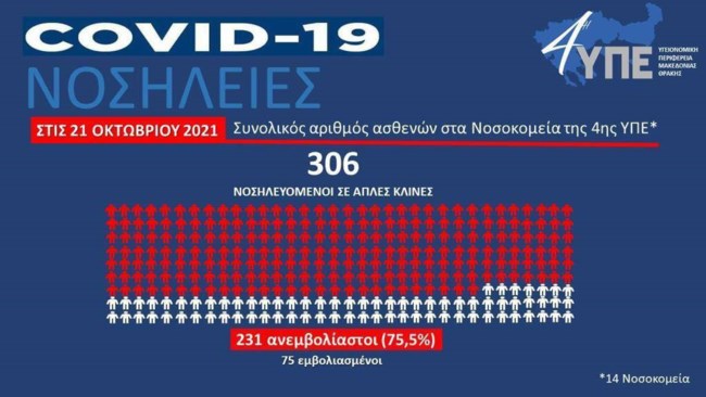 Για τους νοσηλευόμενους σε απλές κλίνες, από τους 341 οι 271 είναι ανεμβολίαστοι και μόλις οι 70 έχουν εμβολιαστεί. Τέλος, στην 4η ΥΠΕ από 306 που νοσηλεύονται σε απλές κλίνες οι 231 είναι ανεμβολίαστοι και 75 έχουν εμβολιαστεί.