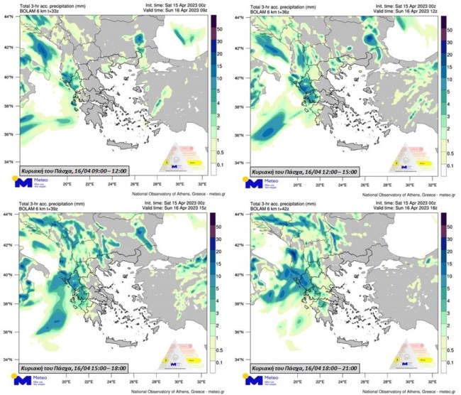 Ο υετός που αναμένεται ανά τρίωρο από το πρωί έως το απόγευμα της Κυριακής του Πάσχα