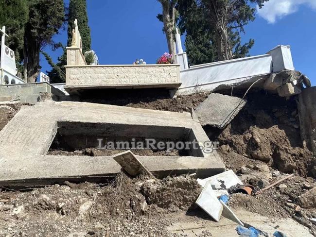 Όπως αναφέρει το LamiaReport.gr, πρόκειται για το κοιμητήριο που βρίσκεται στην βόρεια πλευρά της πόλης της Λαμίας. Όπως φαίνεται στις παρακάτω εικόνες, τα νερά από την ισχυρή βροχόπτωση που πέρασαν μέσα από το κοιμητήριο, γκρέμισαν τη μάντρα στη νοτιανατολική πλευρά, παρασύροντας και τάφους.