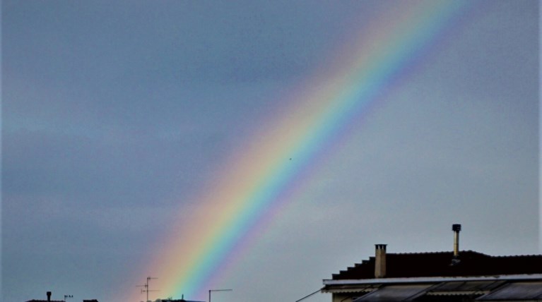 Το "παιχνίδι" βροχής και ήλιου είχε ως αποτέλεσμα να προβάλλει ένα εντυπωσιακό ουράνιο τόξο, το οποίο μαγνήτισε τα βλέμματα και απαθανατίστηκε από κινητά και φωτογραφικές μηχανές.